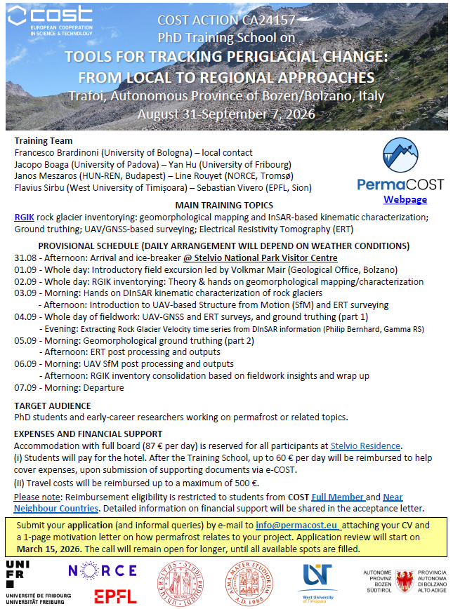 I hope that you are having a great start to the new year! The PermaCOST Action (CA24157) is hosting a PhD training school on “Tools for tracking periglacial change: from local to regional perspectives” for 25 students in Trafoi, Italy, from August 31 – September 7 2026. The course covers training on RGIK rock glacier inventorying, DInSAR kinematic characterization, UAV-based Structure from Motion (SfM), Electrical Resistivity Tomography (ERT), UAV-GNSS, and more! Please see the advertisement for more information.